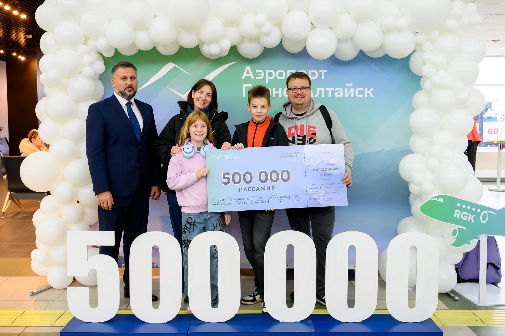 Аэропорт Горно-Алтайск достиг знакового рубежа, зафиксировав обслуживание 500-тысячного пассажира с начала 2025 года. Данное событие свидетельствует о значительном опережении прошлогодних темпов пассажиропотока в прошлом году отметка в 450 000 пассажиров в аэропорту Горно-Алтайск была достигнута только в декабре. Пассажиропоток показатель динамичного развития аэропорта и эффективности стратегии по повышению качества обслуживания и привлечению новых авиакомпаний. Юбилейными пассажирами в 2025 году стала семья Казаковых Иван и Юлия, с детьми Тихоном и Василиной, вылетевшие рейсом SU 1525 авиакомпании «Аэрофлот» по маршруту Горно-Алтайск Москва. В честь достижения полумиллионной отметки по пассажиропотоку семье Казаковых были вручены фирменные подарки от «Аэрофлота», от аэропорта Горно-Алтайск предоставлен годовой абонемент на бесплатное посещение бизнес-зала для ожидания вылета рейса, а от курорта «Манжерок» вручен сертификат на СПА-процедуры в отеле и ужин в ресторане.